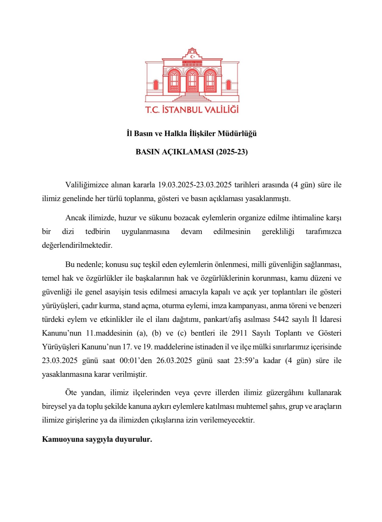 'Valiliğimizce alınan kararla 19.03.2025-23.03.2025 tarihleri arasında (4 gün) süre ile ilimiz genelinde her türlü toplanma, gösteri ve basın açıklaması yasaklanmıştı.