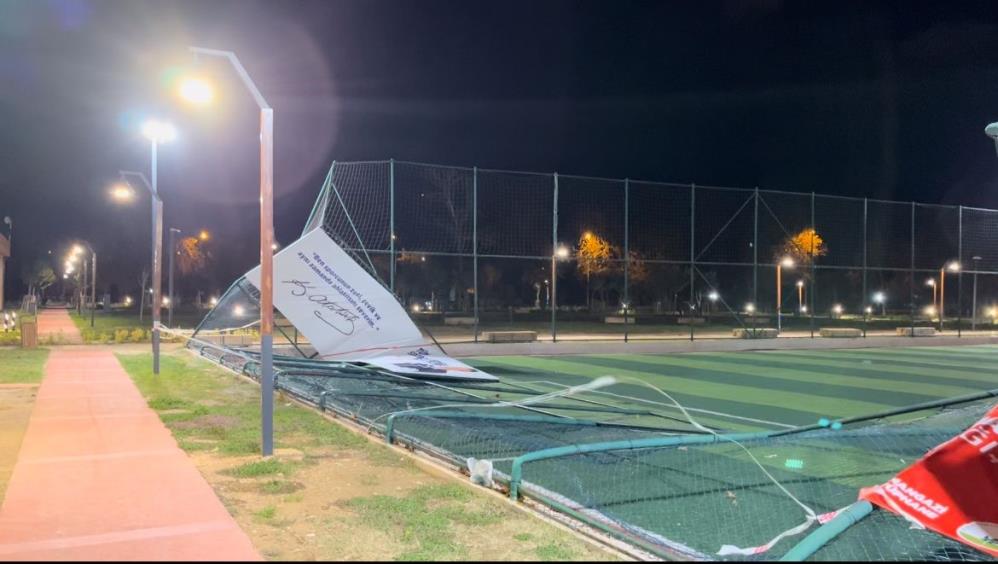 Lodos fırtınası şiddetini arttırdığı Bursa’da, millet bahçesinde bulunan halı sahanın altı üstüne geldi. Etrafından tel çitler yerinde söküldü, pankartlar koptu.