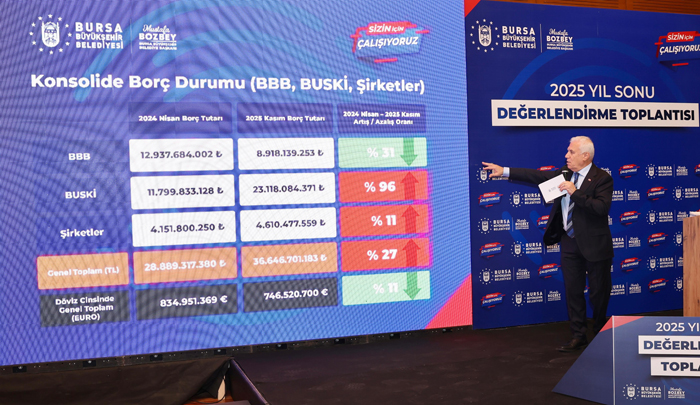 Bursa Büyükşehir Belediyesi’nin mali yapı tablosu hakkında bilgi de veren Başkan Mustafa Bozbey, her şeyin başında sağlam bir mali yapının olduğunu dile getirdi. Bir yandan hizmet üretirken, diğer yandan belediyenin mali yapısını güçlendirdiklerini anlatan Başkan Mustafa Bozbey, “Nisan 2024’te Büyükşehir’in borcu 13 milyar civarındaydı. 2025 yılı sonunda bu rakamı 9 milyar TL’ye düşürdük. 4 milyar civarında borcumuzu azaltmış olduk. Hem hizmet ürettik, hem iş yaptık, hem de doğru projeleri doğru zamanda uygulayarak tasarruf sağladık. Borcumuz yüzde 31 düşmüş. BUSKİ’nin Nisan 2024’te 11 milyar 800 milyon lira olan borcu, Kasım sonu itibariyle 23 milyar oldu. BUSKİ’nin borcu yüzde 96 arttı. Biz olsaydık bu işin başında bu 23 milyar olmazdı. Hem beceremedikleri işler daha önce olurdu. Hem de bu borcun altında borç görürdük. Şirketlerde de yüzde 11 civarında bir artış var. Toplama bakıldığında yaklaşık 1 milyar Euro civarında bir borç yükü almıştık. 835 milyon Euro’ya düşürdük. 20 ayda hem hizmet ürettik, hem toplam borcu yüzde 11 azalttık. Bize gelen paranın, Bursalılar adına geldiğini, 3.3 milyon Bursalının parası olduğunu, onların parasını kullanan kişiler olduğumuzun bilincindeyiz. Her kuruşu hesap etmek zorundayız. Bizler Bursalıların ödediği her kuruşunun hesabını verebilen şeffaf ve güçlü bir yapı ve yönetim inşa ettik” diye konuştu.
