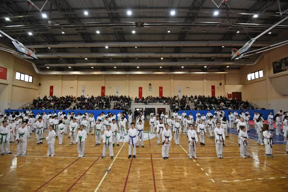 Düzenlenen törende yeni kemerlerine kavuşan karate sporcuları, programın sonunda hocalarından öğrendikleri tekniklerle gösteri maçı yaptı.