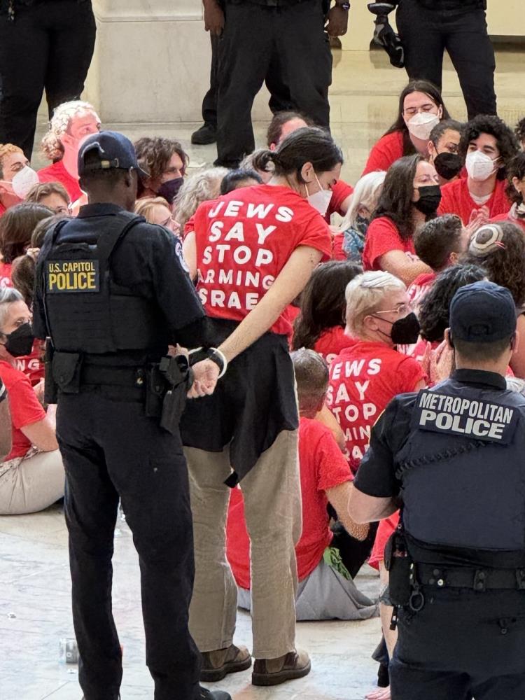 Polisin barışçıl gösteriyi sonlandırma çağrısına uymayan grubun üyeleri plastik kelepçe takılarak gözaltına alınırken, Capitol Polisi’nden yapılan açıklamada gösterinin “yasadışı” olduğu belirtildi. Açıklamada 'Kongre binalarında gösteri yapılmasına izin verilmiyor. Yasal olarak içeri girenlere gösteriyi sonlandırmalarını, yoksa tutuklanacaklarını söyledik. Durmadılar, biz de onları tutukluyoruz” ifadeleri kullanıldı. Gözaltı sayısına dair kesin bilgi verilmezken, JVP’den yapılan açıklamada ise 300’ü aşkın göstericinin gözaltına alındığı belirtildi.