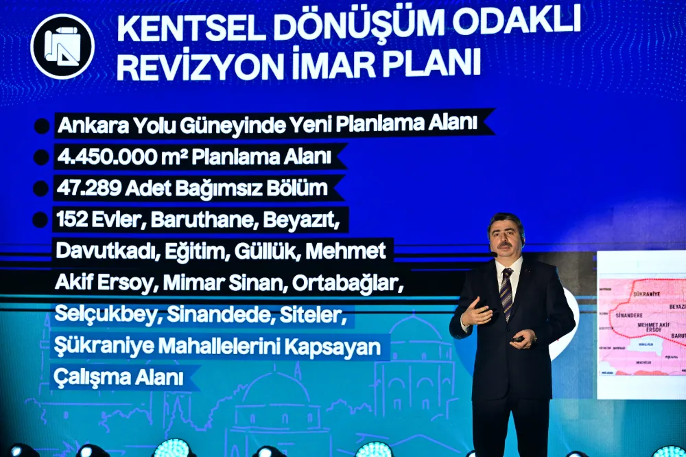 Kentsel dönüşüm noktasında önemli hedefler koyduklarını belirten Başkan Yılmaz; “Göre gelirken ‘Yıldırım İçin Büyük Düşünüyor, Büyük Dönüşüyoruz’ dedik ve 30 bin yeni konut hedefi belirledik kendimize. Hamdolsun şuana kadar 7 bin 500 konut ürettik. 2029 yılına kadar bu sayıyı 30 bine tamamlayacağız. Tabi kentsel dönüşümün tanımını doğru yapmak gerekiyor. Meselemiz sadece binaları değiştirmek, yeni inşaat alanları üretmek değil. Biz konutlarla beraber; o konutun içinde bulunduğu ekosistemi, sosyal imkanları, çevresel şartları, ulaşım ve altyapı imkanlarını da dönüştürüyoruz” diye konuştu.