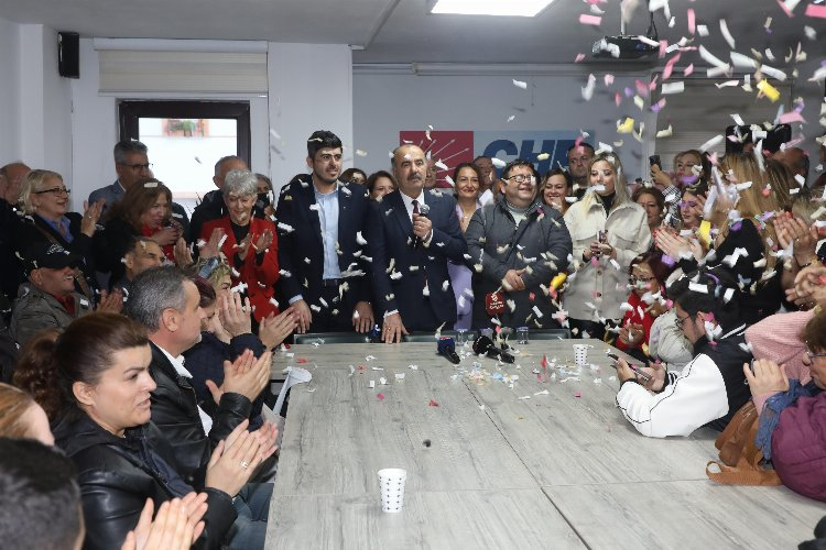 İlçe binasında partililere seslenen Hayri Türkyılmaz, göreve başladığı süreçte Mudanya’da yaşayanlara verdiği sözleri hatırlatarak, "Bugün benim için önemli bir gün. 10 yıl önce Mudanyamıza hizmet noktasında girdiğim ön seçimi tüm engellemelere rağmen kazandım ve ardından 30 Mart 2014 Yerel Seçimlerinde 25 yıl aradan sonra CHP’den Mudanya Belediye Başkanı seçildim. Kültürden sanata, sosyal belediyecilik örneklerinden turizme her alanda onlarca projeyi söz verdiğim gibi hayata geçirdim. Kentimizin geleceğini şekillendiren projelerimizi değerli hemşehrilerimle buluşturduk. Sponsor kullanmadan, bir kuruşluk işi bir kuruşa yaparak, alın terimizle çalıştık. Mudanya’da ilkleri gerçekleştirdik. Ürettiğimizi hakça paylaştık, büyüttük. Unutmayın ki dinlenmemek üzere yola çıkanlar, asla yorulmazlar. 30 Mart 2014'te gururla diktiğimiz CHP bayrağını bir daha indirmemek üzere görev yaptık, görev yapmaya da devam edeceğiz” ifadelerini kullandı.