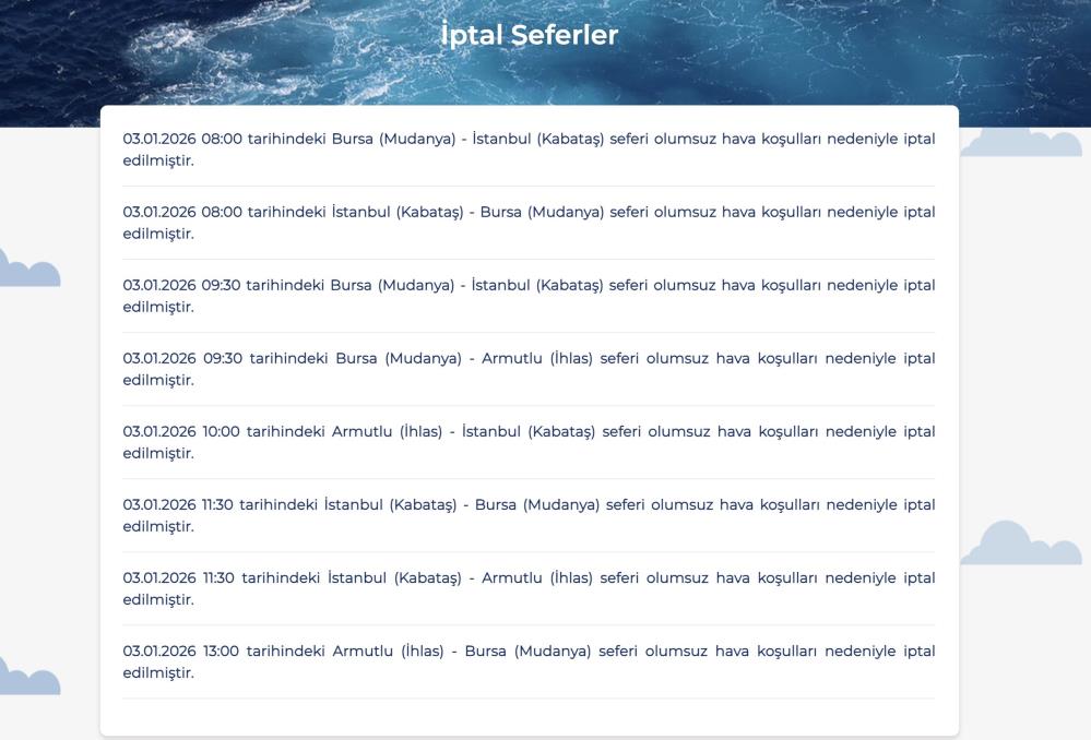 İptal edilen seferler şöyle: 08.00 Bursa (Mudanya) - İstanbul (Kabataş) - 08.00 İstanbul (Kabataş) - Bursa (Mudanya) - 09.30 Bursa (Mudanya) - İstanbul (Kabataş) - 09.30 Bursa (Mudanya) - Armutlu (İhlas) - 10.00 Armutlu (İhlas) - İstanbul (Kabataş) - 11.30 İstanbul (Kabataş) - Bursa (Mudanya) - 11.30 İstanbul (Kabataş) - Armutlu (İhlas) - 13.00 Armutlu (İhlas) - Bursa (Mudanya)