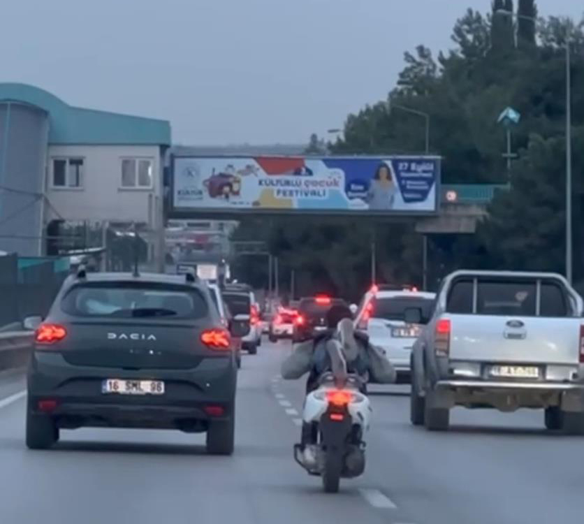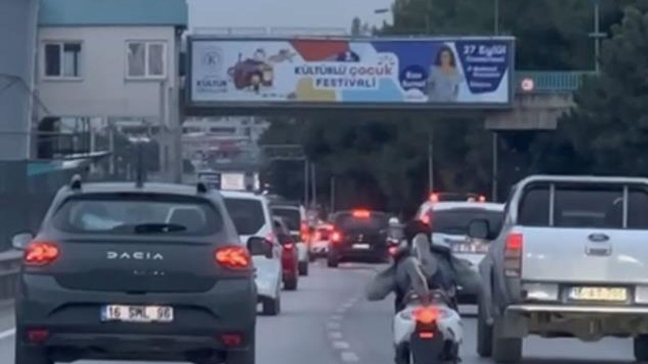 Herkesin şaşkınlıkla izlediği olay, Bursa’nın Nilüfer ilçesi İzmir Yolu Caddesi üzerinde meydana geldi. Plakasız bir motosiklet sürücüsü, yoğun trafikte motorunun üzerine yatarak araçların arasından hızla geçti. Sürücünün bu tehlikeli hareketleri yürekleri ağza getirdi.
