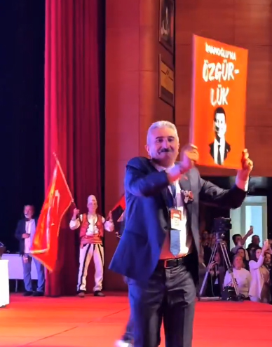Konuşma yapmak için kürsüye ‘Ekrem İmamoğlu’na Özgürlük’ pankartıyla çıkan Nihat Yeşiltaş, partililerden yoğun alkış aldı.