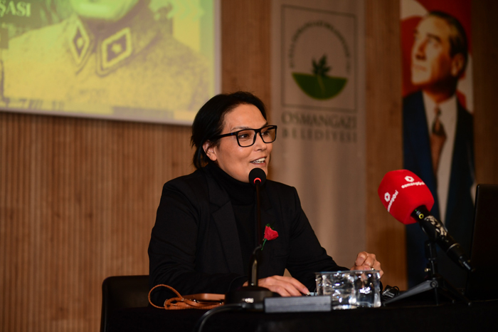 Doç. Dr. Hacer Karabağ Arslan ise, “Öncelikle Osmangazi Belediyemize ve BAL-GÖÇ’e çok teşekkür ediyorum. İlber Ortaylı, ‘Atatürk’ adlı eserinde şöyle başlar söze ‘Genellikle sanatkarlara, filozoflara ifade edilen büyük bir sevgi vardır, büyük bir muhabbet vardır, yıllar geçse de gittikçe artan, siyasilere ve devlet adamlarına, askerlere pek de böyle bir muhabbetten, sevgiden, özlemden bahsedemeyiz ama biz, her geçen yıl daha büyük bir muhabbet ve özlemle Atatürk’ü anmaktayız. Her yıl 10 Kasım’da da bunun, katlanarak arttığını görüyoruz.” diye konuştu.