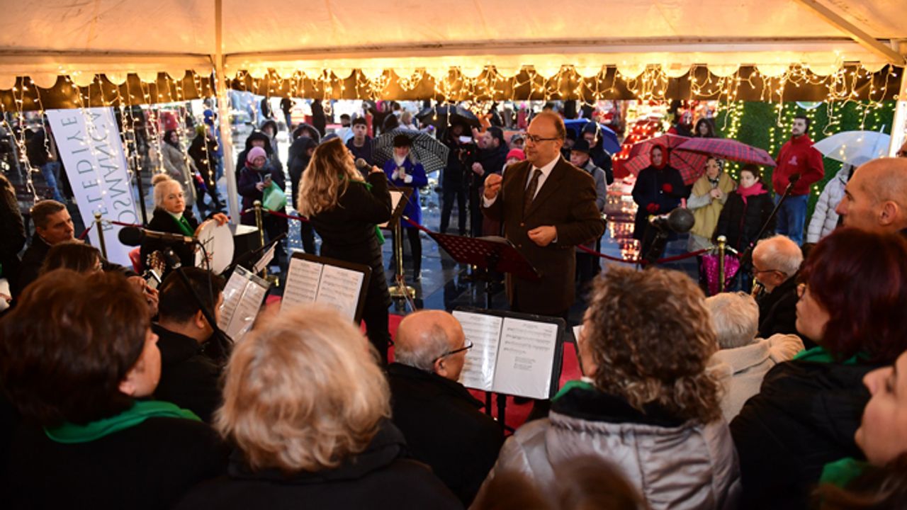 Osmangazi Belediyesi’nin ev sahipliğinde Osmangazi Meydanı’nda Bursalıları ağırlayan Yeni Yıl Festivali, 2026’ya sayılı günler kala vatandaşların ilgi odağı olmaya devam ediyor. Festivalin üçüncü haftası geride kalırken, etkinlikler kapsamında Uludağ Sanat Derneği Müzeyyen Senar Türk Sanat Müziği Korosu sahne aldı. Repertuvarında Türk sanat müziğinin dillere pelesenk olan seçkin eserlerine yer veren Hilmi Bozdemir şefliğindeki koro, soğuk havaya rağmen kendilerine yoğun ilgi gösteren dinleyicilerinin yüreklerini ısıttı. Performanslarıyla beğeni toplayan koro üyeleri, Bursalıları festivalde geçmişe doğru bir yolculuğa çıkardı.