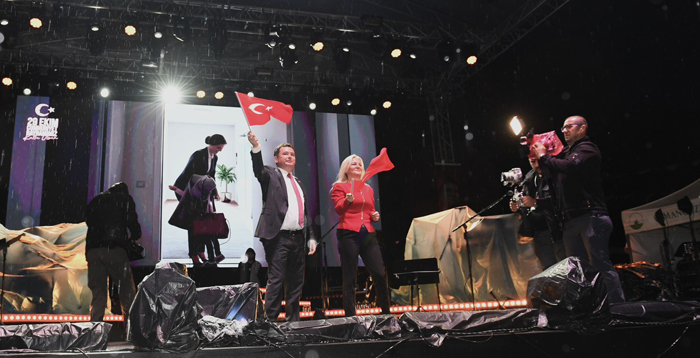 Konuşmaların ardından Başkan Erkan Aydın, eşi Nadire Aydın ile birlikte sahneye çıkarak ünlü sanatçıya çiçek ve teşekkür plaketi takdim etti.