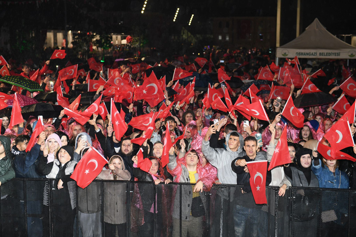 Konseri vatandaşlarla birlikte izleyen Osmangazi Belediye Başkanı Erkan Aydın, “Cumhuriyet Bayramı coşkusunu kalplerimizin en güzel yerinde, hep birlikte paylaşmak üzere hepiniz hoş geldiniz. Yağmura ve soğuğa rağmen, bu meydanı dolduran sizlerin varlığı, Cumhuriyet’e olan sevdamızın en güçlü göstergesidir. Biz şikayet etmiyoruz. Çünkü biliriz ki, yağmur berekettir, umuttur, gelecektir. Bu akşam da, Cumhuriyetimizin 102’nci yılını Zeynep Bastık konseriyle hep birlikte kutluyoruz. Burada Cumhuriyetine sahip çıkan, geleceğine umutla bakan, asla geri adım atmayan gençleri görüyorum. Gökyüzü ağlamadan gökkuşağı görülmez. Güzel günler çok yakın. Bugünleri hep birlikte geçecek, yarınların güneşli günlerine hep birlikte yürüyeceğiz. Cumhuriyet’in bize kazandırdığı faziletlerle, erdemle, onurla ve umutla yaşamayı sürdüreceğiz. Bize bu onurlu yaşam hakkını armağan eden Büyük Önder Gazi Mustafa Kemal Atatürk ve silah arkadaşlarını rahmet, minnet ve saygıyla anıyorum. O halde, yaşasın Cumhuriyet. Nice 102 yıllara” dedi.