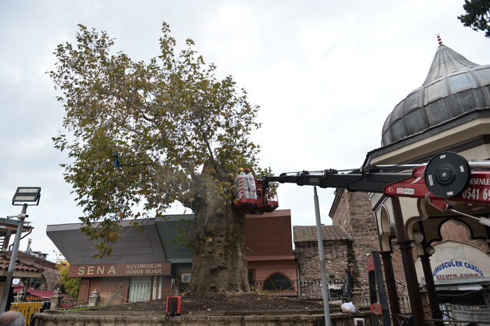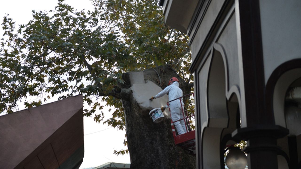 Park ve Bahçeler Dairesi Başkanlığı ekipleri tarafından yapılan incelemede, anıt ağacın açık yarasında çürümüş ve mantarlaşmış bölümler tespit edildi. Hızlı bir şekilde bakım ve restorasyon işlemlerine başlayan ekipler, özel ilaçlarla ‘çürümeye yol açan’ bakterileri temizledi. Ağacın iskeletine teller aracılığıyla destek uygulanırken, son aşamada özel yalıtım malzemesi kullanılarak ağacın açık yarası kapatıldı. Tedavi gören kısım boyanarak çınar ağacının formu yeniden düzenlendi.
